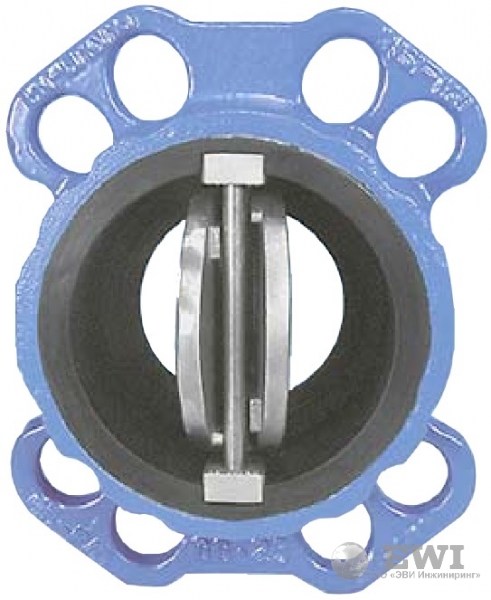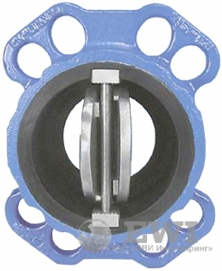 Корпус клапана изготовлен из чугуна, пластины — из нержавеющей стали AISI 316 или ковкого чугуна GGG40, седло изготавливается из EPDM или NBR, вал — из нержавеющей стали AISI 304, пружина — из нержавеющей стали AISI 302. Присоединение — вафельное по PN6/10/16, ANSI150, BS таблица E/D, JIS 5K/10K. Диапазон рабочих температур — +120 °C.